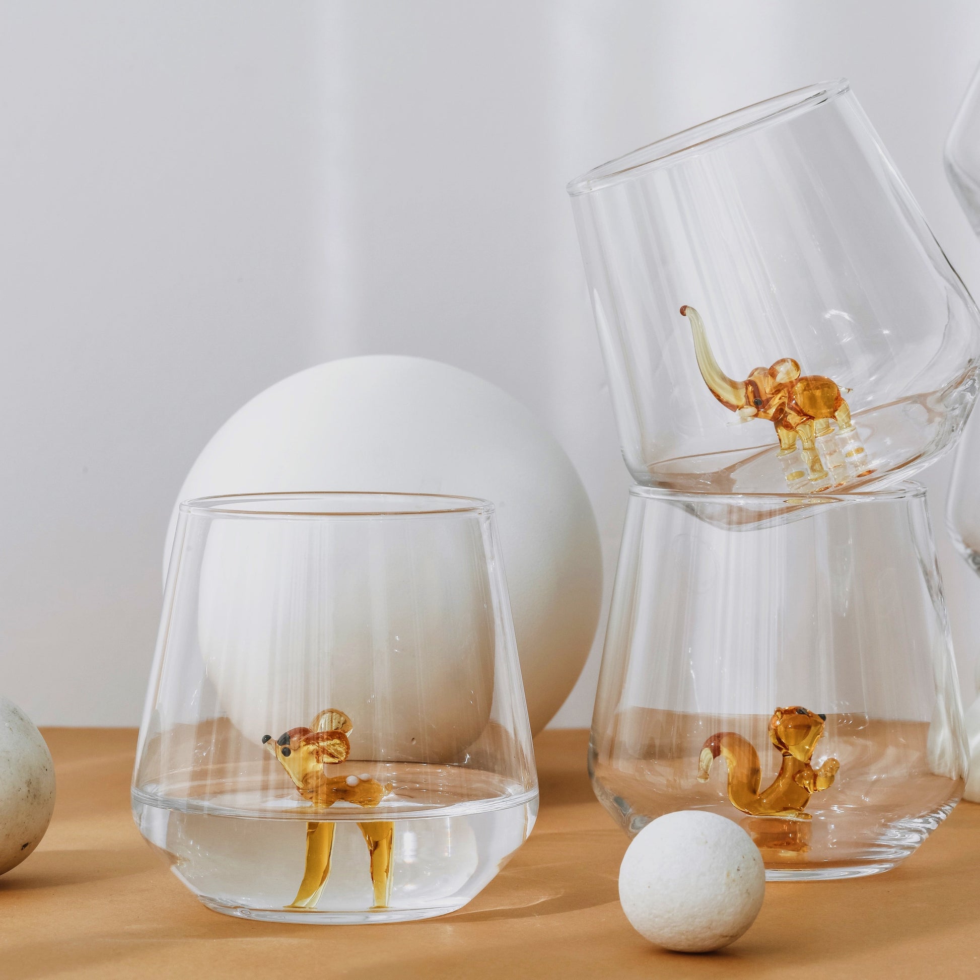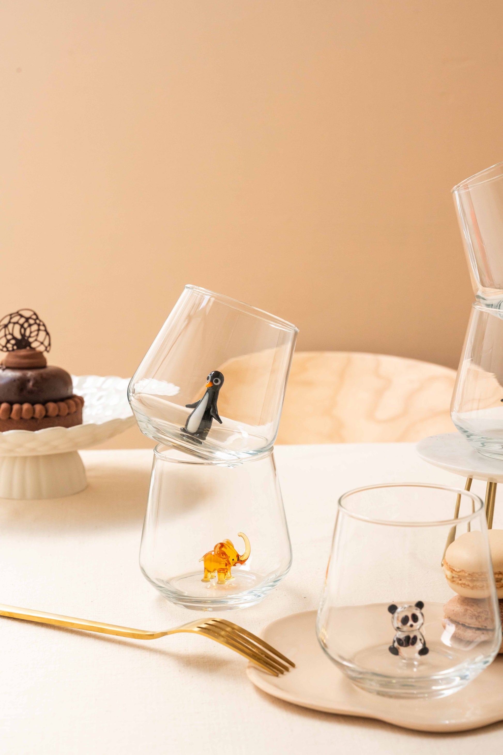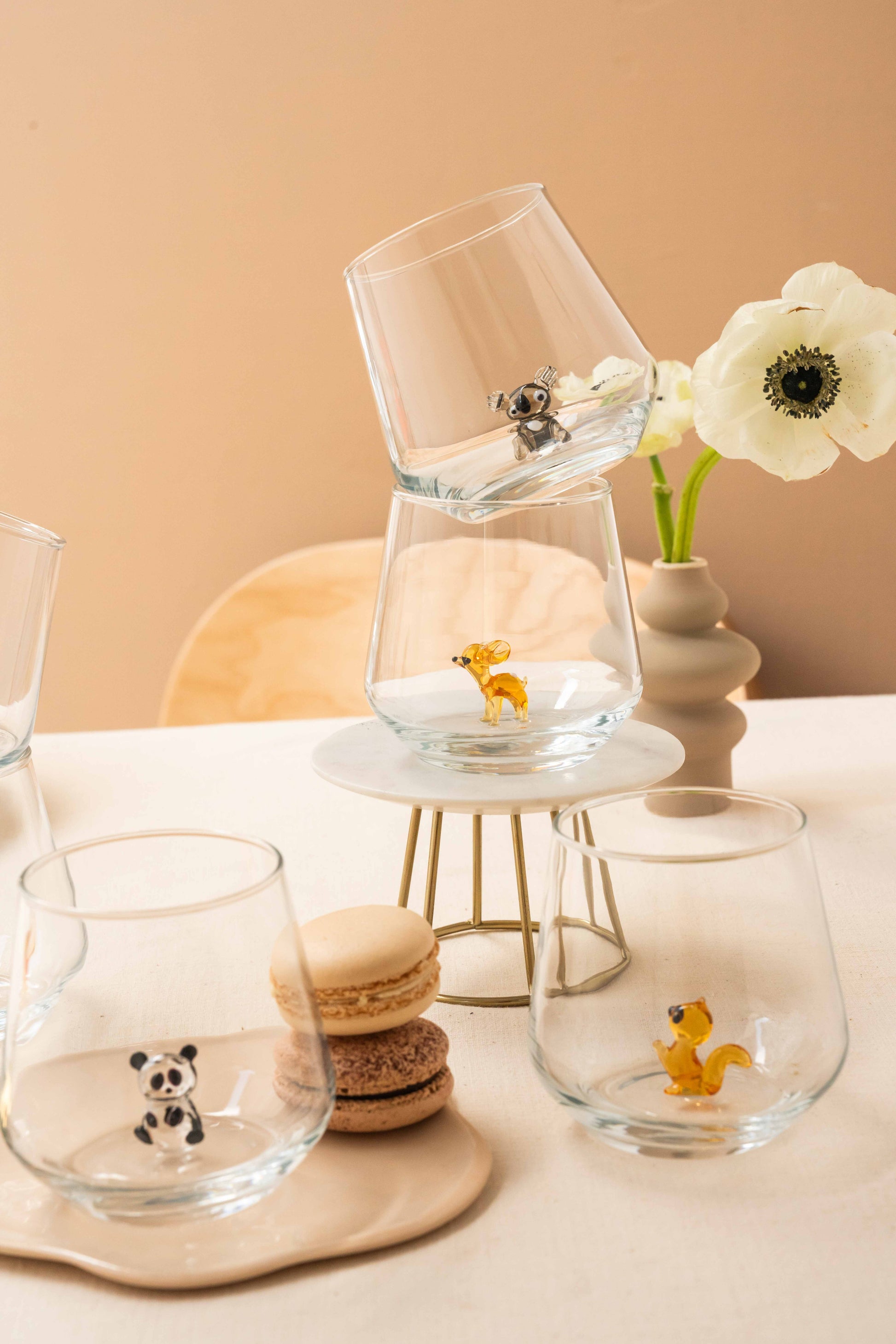 An animal from every continent, united in the Minizoo Continents family. The panda from Asia, the koala from Australia, the elephant from Africa, the bambi from America, the squirrel from Europe and the penguin from Antarctica. This set includes water glasses of 345cc. The figures are made of Murano glass, handmade.