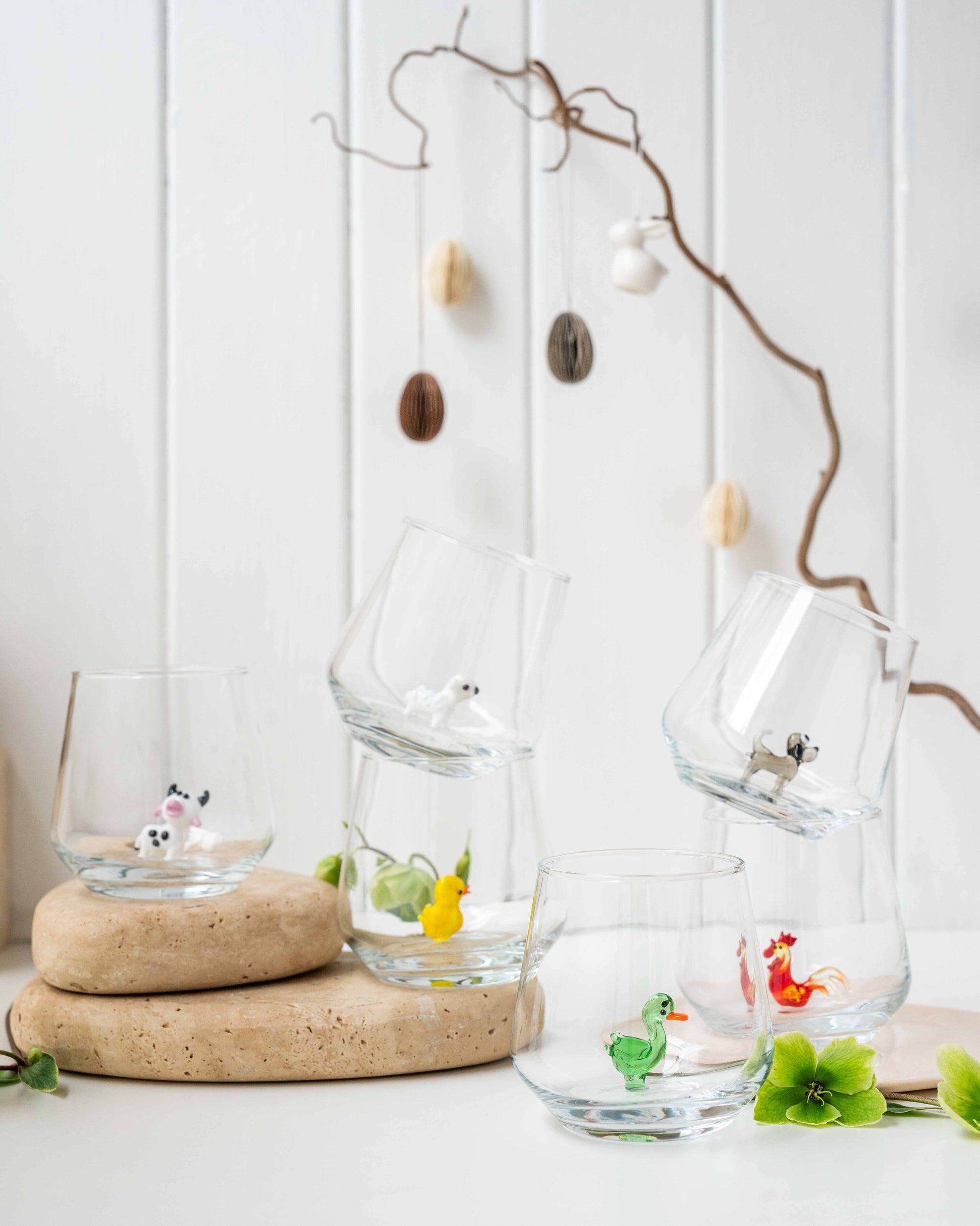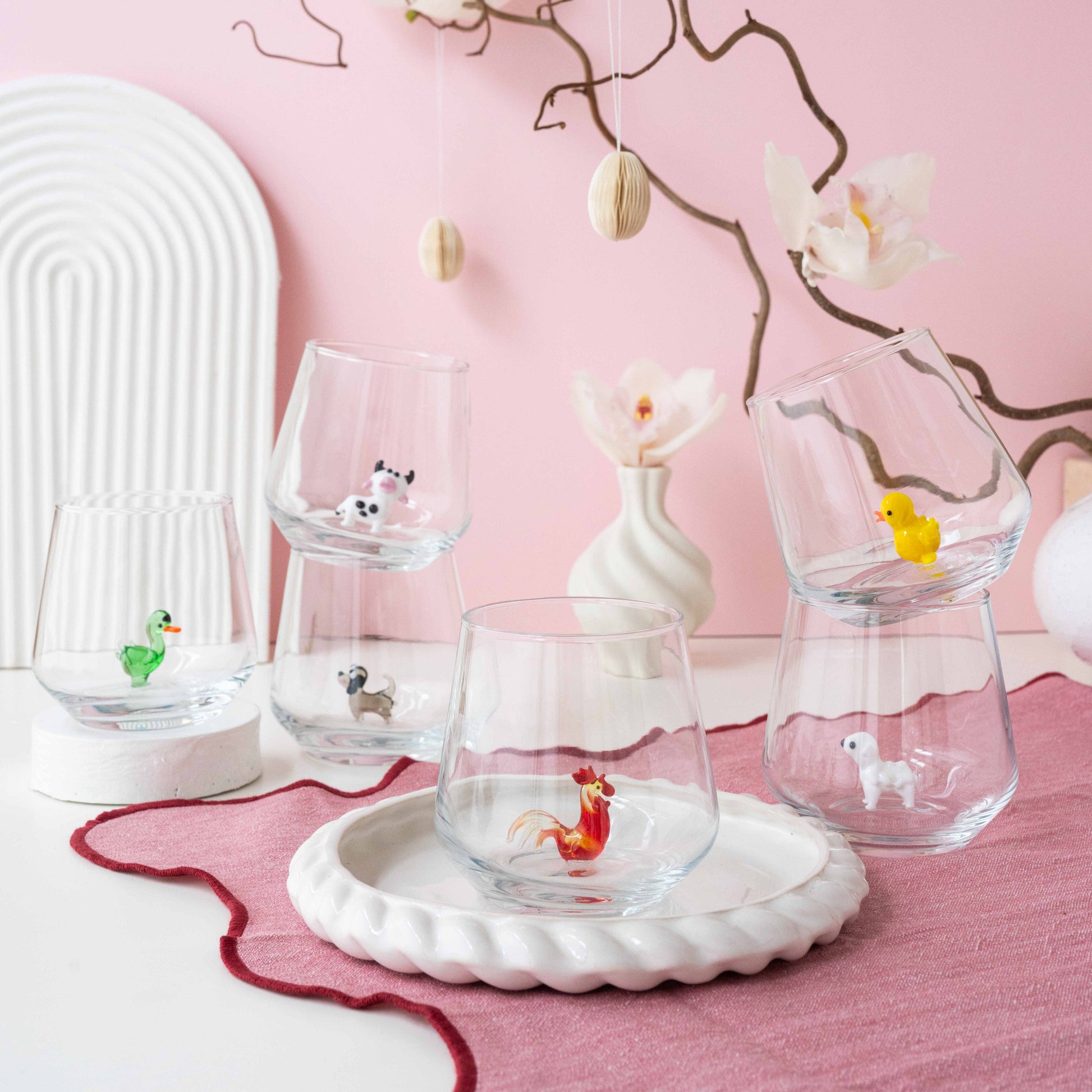 All the animals in the farm you discover with the mini zoo farm set The dogs, the cow, the duck, the rooster the chick. This set includes water glasses with 345cc. The figures are made of Murano glass, handmade.